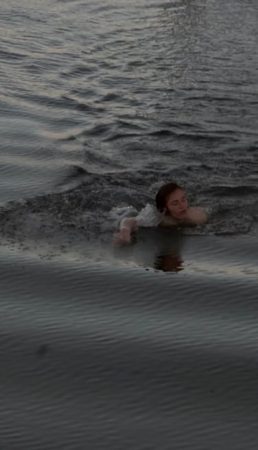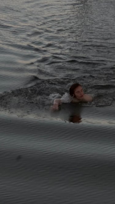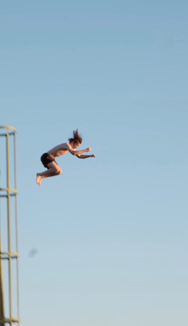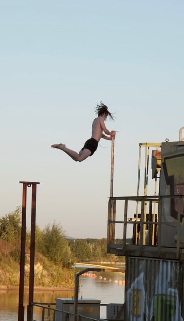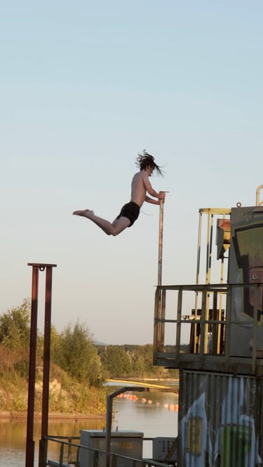 The video shows freerunning athlete Levin Koch performing from a dredger in a lake.